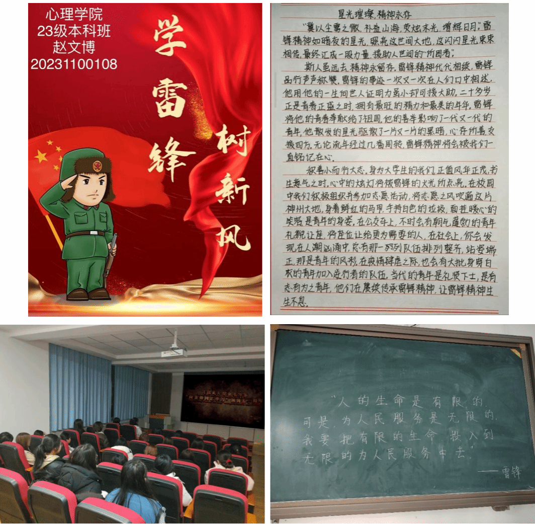思想引领铸信念,知行合一学雷锋。春风送暖,三月芳华,为弘扬雷锋精神,践行新时代青年使命,我院以“雷锋精神暖三月”为主题,开展了系列特色活动,将心理专业优势与志愿服务深度融合,让雷锋精神在校园里生根发芽,在社区中传递温暖。通过多维宣传,学习雷锋精神,组织学生赏析影片《雷锋》《青春雷锋》、组织开展“雷锋精神与我”主题演讲比赛、创意海报设计大赛、书法比赛、征文比赛等活动,以水墨丹青与现代设计融合,诠释“钉子精神”与“螺丝钉品格”、以笔为媒,书写雷锋箴言与感悟,让“奉献、友爱、互助、进步”的志愿信念扎根心田。