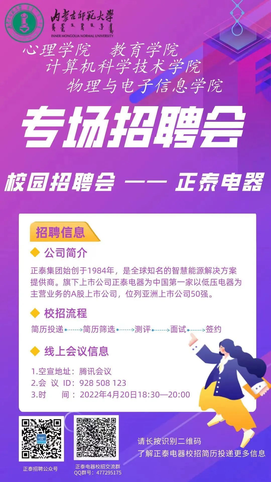 为深入贯彻党中央、国务院“稳就业”“保就业”决策部署,进一步做好毕业生就业工作,拓宽就业渠道,实现高质量就业, 4月20日,yl7703永利集团通过校友积极联系正泰电器,面向yl7703永利集团、教育学院、物理与电子信息学院、计算机科学技术学院等召开2022届毕业生线上专场招聘会。