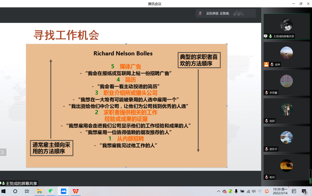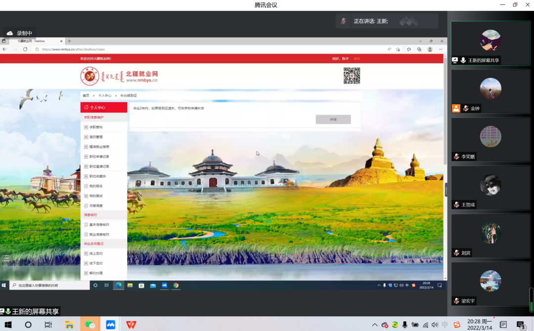 为贯彻党中央、国务院“稳就业”“保就业”决策部署,落实学校就业工作要求,推进我院2022届毕业生就业工作,促进毕业生高质量就业,yl7703永利集团于2022年3月14日晚特邀请我校永利集团处就业市场部部长刘在青、永利集团处职业发展指导中心主任王贺成、永利集团处就业信息服务中心王新三位老师开展线上就业政策讲座,我院党委书记七十三、院长乌云特娜、副院长侯友、全院教师及2022届毕业生参加讲座,讲座由学院党委副书记副院长张晓阳主持。