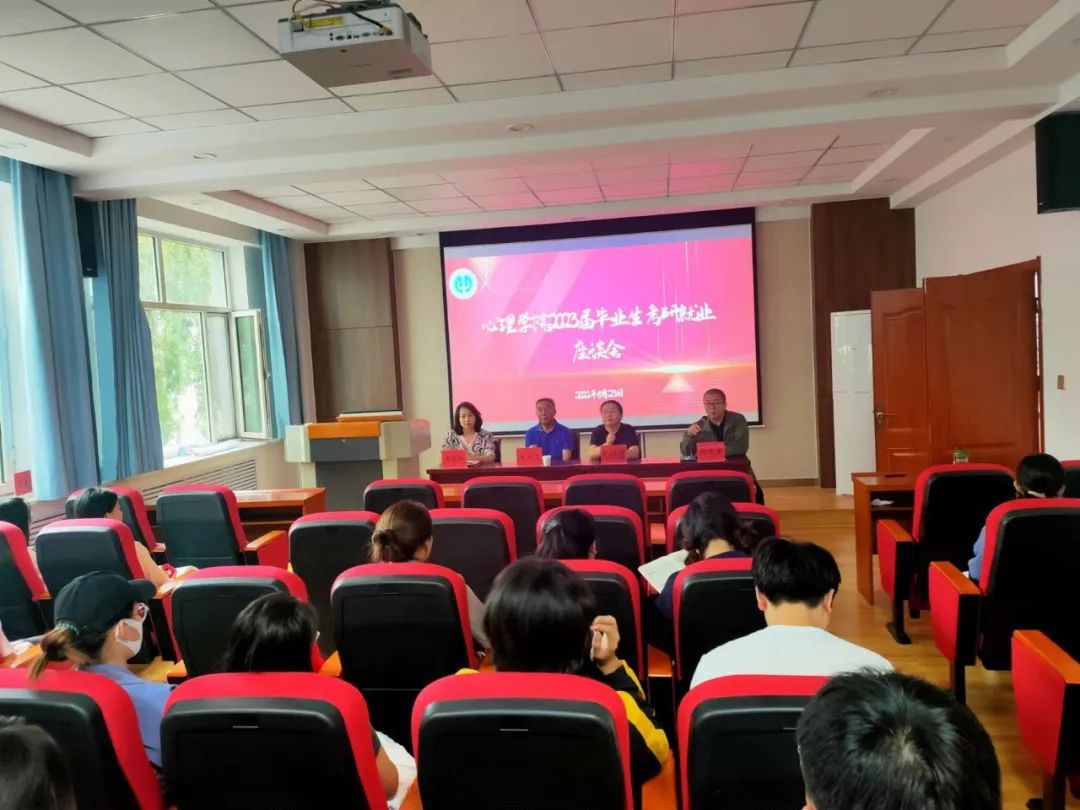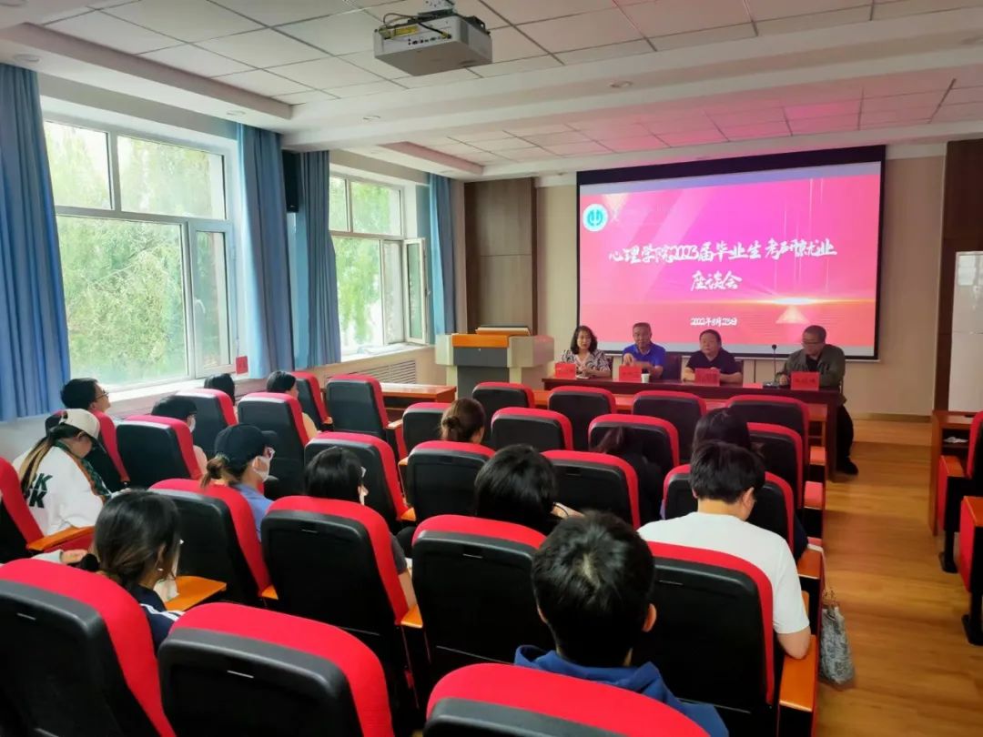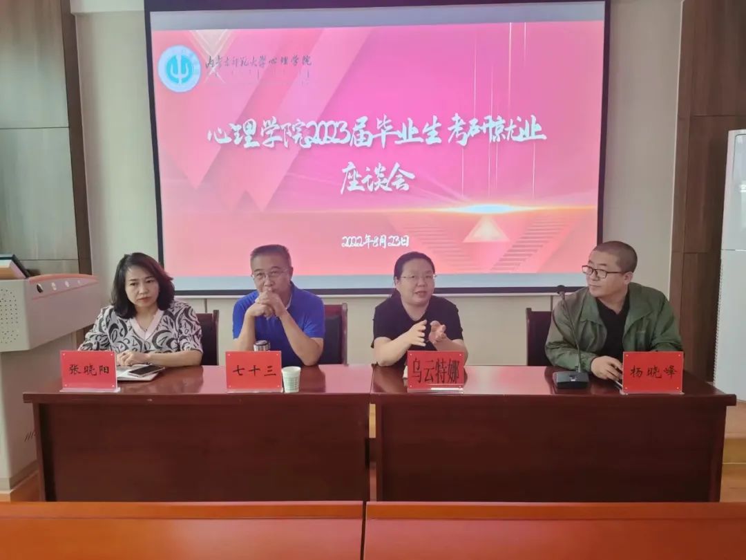 为做好稳就业、保就业工作,8月23日下午,yl7703永利集团召开2023届毕业生考研就业座谈会。学院党委书记七十三、院长乌云特娜、院党委副书记副院长张晓阳及2019级心理学班班主任杨晓峰出席会议,2019级心理学班全体学生参会。