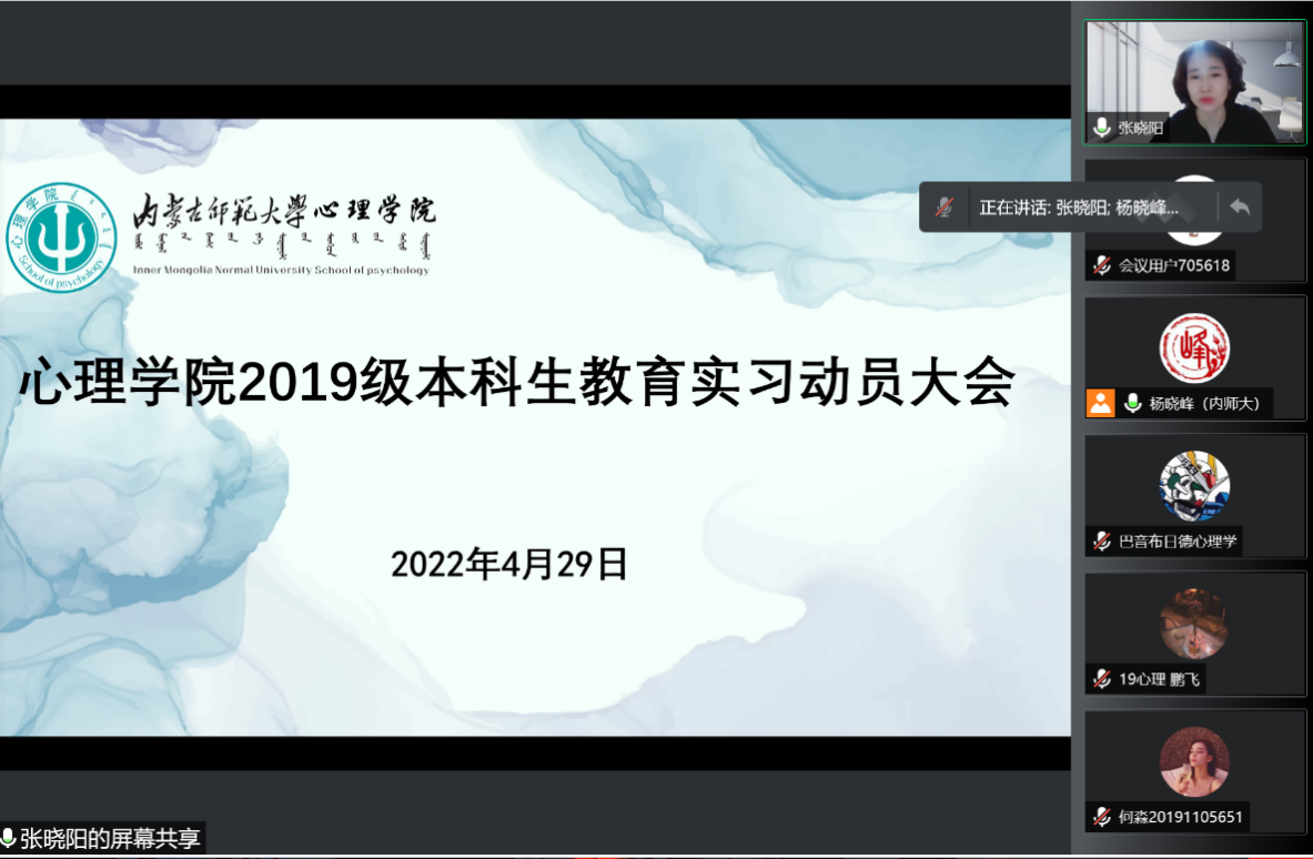 为按照教学计划如期开展本科生教育实习实践,保障教育实习质量,4月29日,我院组织召开2019级本科生教育实习动员大会。yl7703永利集团党委副书记、副院长张晓阳,系主任、2019级心理学班班主任杨晓峰和2019级全体本科生参加会议。受疫情影响,本次实习采取学生就近自主实习,校内导师线上指导与实习学校指导老师线下指导相结合的形式开展。