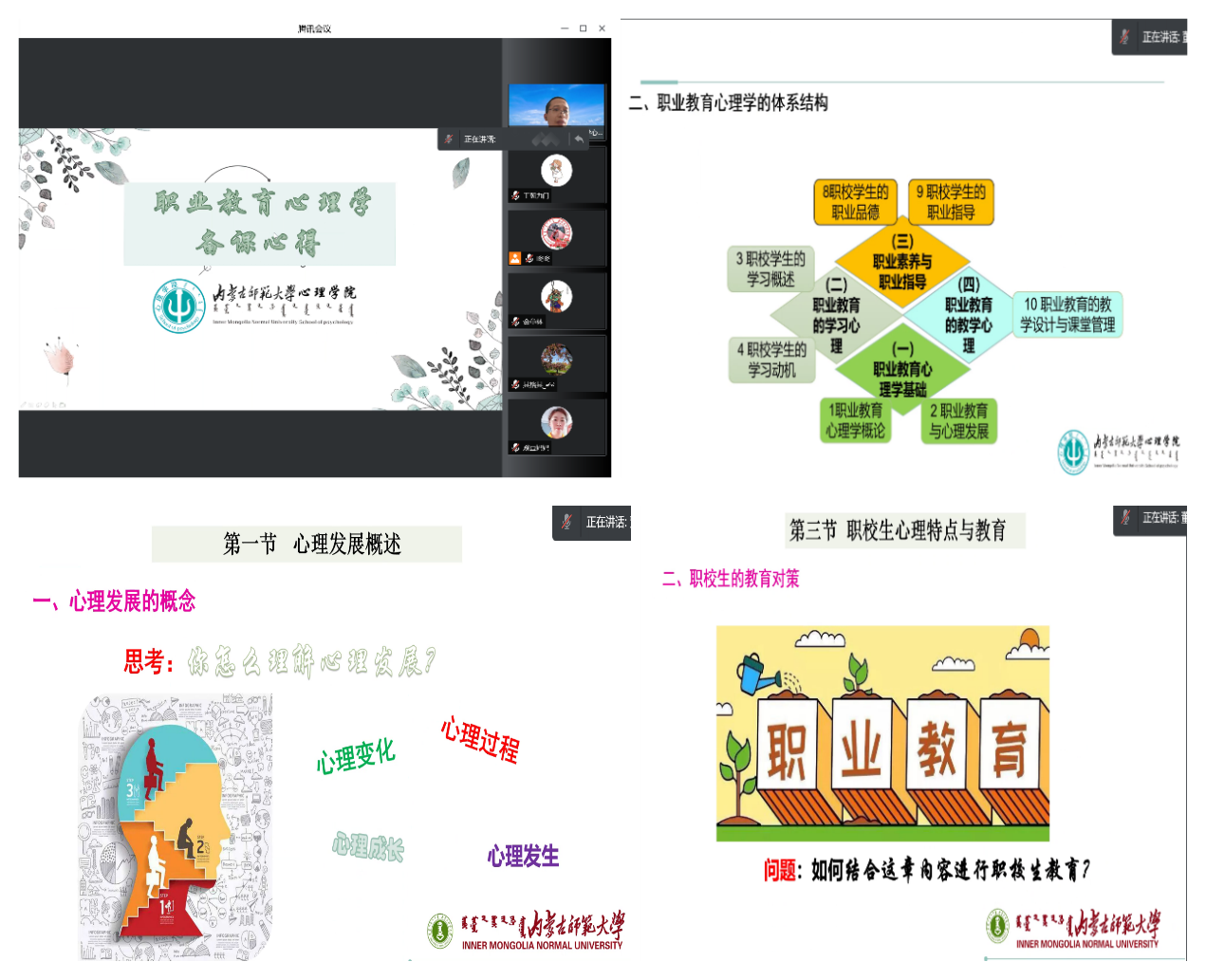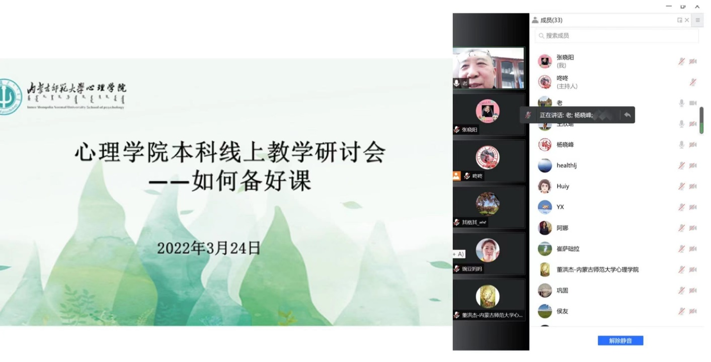 为了进一步提升线上教学效果,促进本科教学质量,3月24日下午,在各教研室充分开展线上教学研讨的基础上,yl7703永利集团召开“如何备好课”——本科线上教学研讨会。学院党委书记七十三、院长乌云特娜、党委副书记张晓阳、副院长侯友及全体教师参加。心理学系主任杨晓峰、中学教育心理学教研室主任解翠玲、职业教育心理学教研室主任董洪杰、心理健康教育教研室主任赵媛分别做了经验交流和分享。