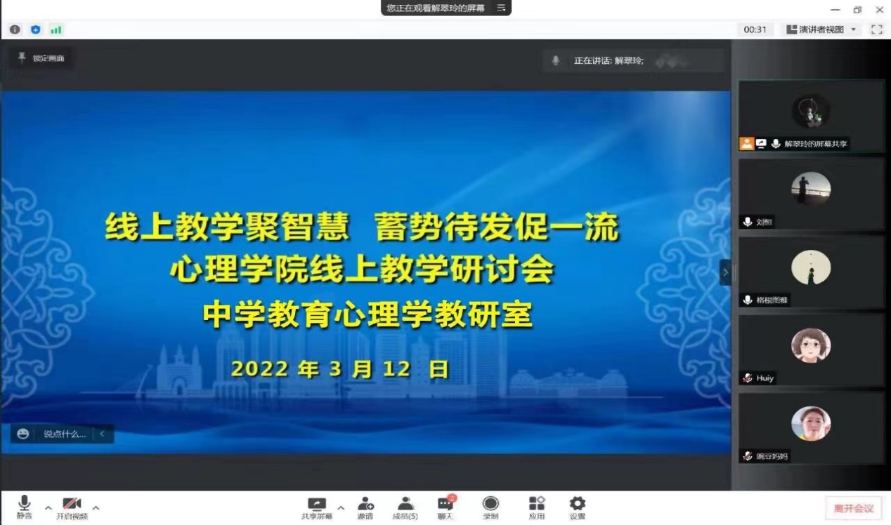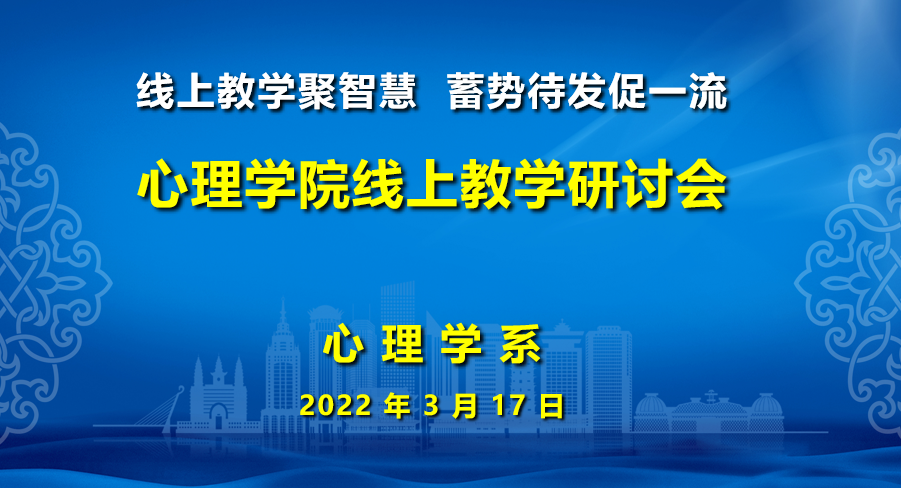 为进一步加强我院线上教学组织管理工作,全力保障线上教学质量,按照学校相关要求,3月12日-17日,学院心理学系、中学教育心理学教研室和职业教育心理学教研室分别以“线上教学聚智慧,蓄势待发促一流”为主题召开了线上教学工作交流研讨会。