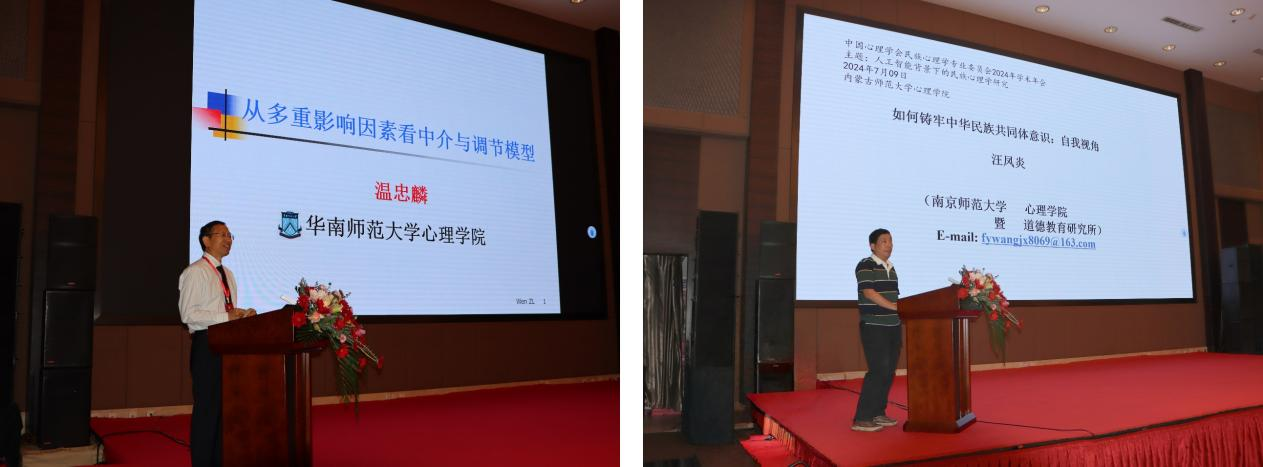 开幕式后,华南师范大学温忠麟教授、南京师范大学汪凤炎教授、上海交通大学李卫东教授、浙江大学周宵研究员和yl7703永利集团王欣瑜教授分别就《从多重影响因素看中介与调节模型》、《如何铸牢中华民族共同体意识:自我视角》、《AI 与脑机交互技术在抑郁中的探索研究》、《青少年创伤心理的变化特征及代际影响》和《深层文化结构视阈下的中国心理学本土化省思》等议题做了五场特邀报告,分享了民族心理学国内前沿科研成果和实践经验,为与会者奉献了一场高水平的饕餮盛宴。