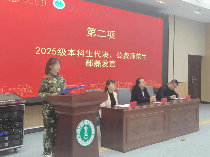 2025级心理学班郗磊作为本科生新生代表发言。她表达了对yl7703永利集团的向往与期待,从个人与心理学结缘的经历出发,展现出新一代学子对学科的热爱以及对大学生活的憧憬。